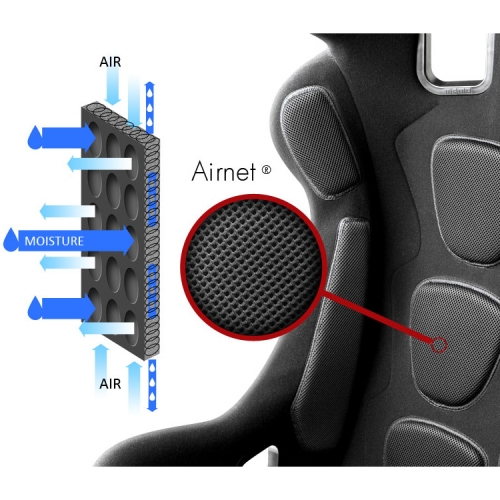 Hans® compatible, range-topping, fiberglass ergonomic seat. Seat shell visible on the rear, front portion upholstered in black fabric. The particular shape of the upper part reduces lateral movements of the helmet and protects the driver's head. Anatomical backseat cushions, designed to give the maximum comfort and the best air flow, helping to reduce driver fatigue during long sessions. The exclusive Airnet® technical material covers all back cushions, and Kinder Point on the seating area provides the best possible grip. Removable double leg cushion to optimize support. External width for side mounts: 390 mm (standard version).