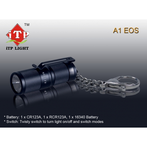 iTP A1 EOS LED Flashlight with Cree XP-E Q5 LED - 190 lumens on 1xCR123A BatteryA Series flashlights come with mini size, Low-Med-High three output levels, head twisty switch to turn light on/off and change modes. Suitable for every day carry, the durable clip make them perfect as pocket flashlights.